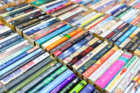 Mumbai India March 3, 2019 Closeup of various second hand books sold in the streets of Mumbai in the afternoon