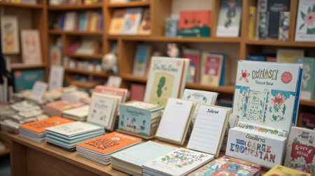 Cozy bookstore display features colorful books, stationery, and charming displays inviting exploration