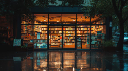 A bookstores glowing interior reflected in its large glass window on a rainy evening.
