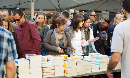 Tarragona, Spain - April 23, 2015: People looking at books in Sant Jordi feast in Tarragona, Catalonia. To gift books and red roses during Sant Jordi is traditionally in Catalonia.
