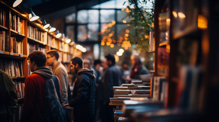 Young man browsing through a local bookstore, surrounded by wooden shelves filled with a diverse collection of literature and novels
