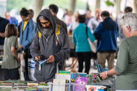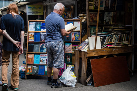 People shopping at book market Petrivka located in Kyiv, Ukraine. Famous for its great range of books. Sprawling open air market with stalls selling secondhand books. Despite the war and the fact that there are no tourists, this place remains very popular
