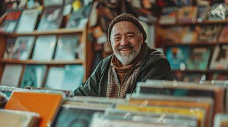 Smiling warmly a record store owner poses with his favorite album infectiously conveying the feelings of nostalgia happiness and comfort that music brings