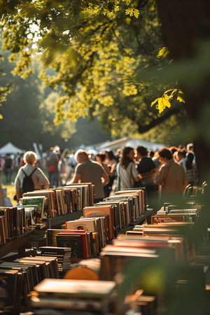 Enthusiastic Readers Browsing Through Books at a Community Outdoor Book Fair in Autumn