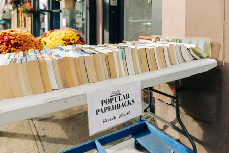 A table holds popular paperbacks for sale outside a bookstore, with vibrant flowers decorating the scene.