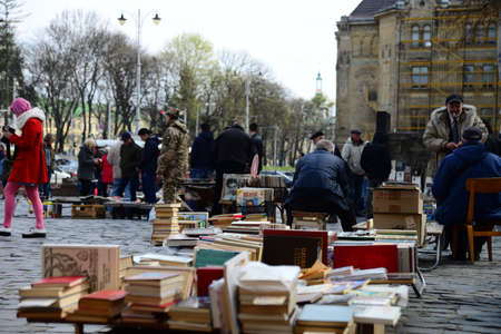 LVIV, UKRAINE - APRIL 17, 2019: Second-hand book market at the monument book printer Ivan Fyodorov in Lviv Ukraine. Ivan Fyodorov published in Lviv Ukraine's first book The Apostle in 1574