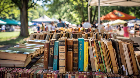 Visitors browse through a diverse selection of neatly organized books at a lively open-air book fair. The atmosphere is filled with enthusiasm as readers explore various genres.