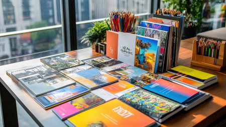 A vibrant creative workspace featuring a variety of colorful brochures and magazines arranged neatly on a wooden table. Brightly colored pencils and plants enhance the inspiring atmosphere. Ideal for design studios or creative professionals seeking a modern office aesthetic.