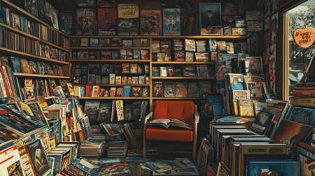 This inviting reading nook features a comfortable chair in a vintage bookstore, surrounded by shelves filled with colorful books and magazines, perfect for relaxation.