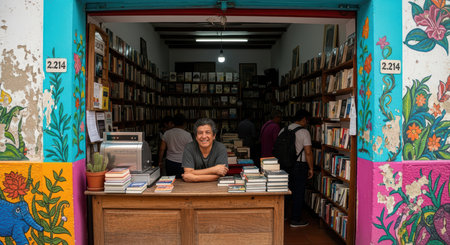 Hispanic male bookseller in colorful bookstore with customers browsing shelves