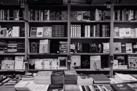 DEC 18, 2013 Singapore - Many kinds of book display on wooden bookshelves in local bookshop. Black and white image