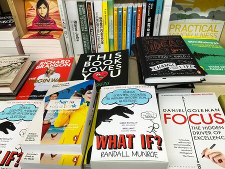 New Delhi, India, September 09 2023 - Variety of Books on shelf inside a book-stall at Delhi International Book Fair, Selection of books on display in Annual Book Fair.