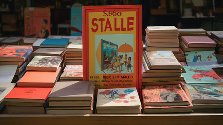 A vibrant book display at an outdoor market stall showcases a variety of titles, creating a colorful backdrop as people browse nearby.