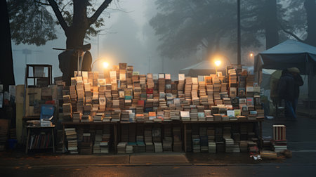 an old stack of books sits on a sidewalk, with a majestic tree in the background. the misty atmosphere adds a touch of mystery to the scene. the panoramic view captures the impressive beauty of the surroundings, while the luminescent installations create a captivating ambiance. the detailed crowd scenes and poignant portraits add depth to the composition, complementing the orderly symmetry of the dusty book