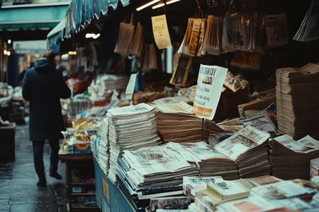A person walks past a vibrant newsstand filled with stacks of newspapers and magazines on a rainy afternoon. The market is lively with colorful publications and a small sign.