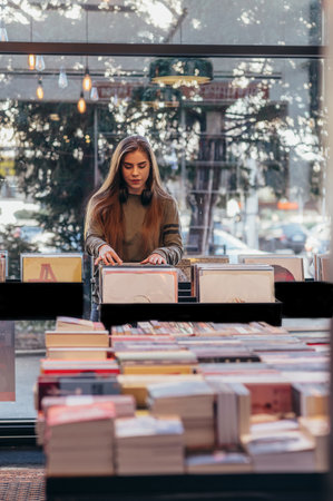 Beautiful woman selecting records in a shop. Young audiophile hipster woman in a record store.