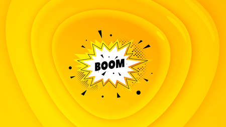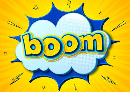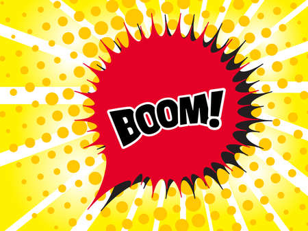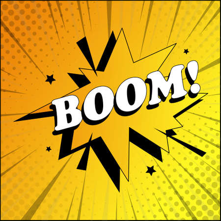 Boom. Cartoon comics poster with burst, speech bubble text and sound effect on yellow background. Colorful vector illustration in comic book and pop art style.