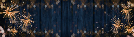 HAPPY NEW YEAR 2022 - Festive silvester firework background panorama greeting card banner long - Golden fireworks on dark blue wood wall texture