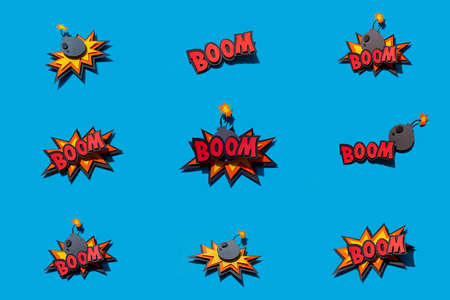Handmade paper speech bubble on blue background. Cartoon and pop art style. Boom text. Expression. Bomb. Set.
