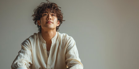 Young man with tousled hair in a white shirt, sitting and looking upwards with a contemplative expression, ideal for introspective or casual themes. With Generative AI technology.