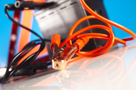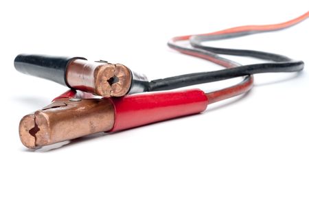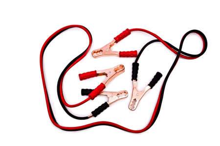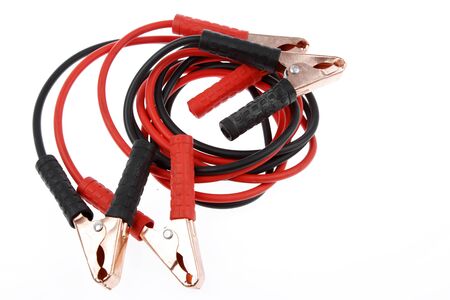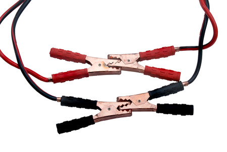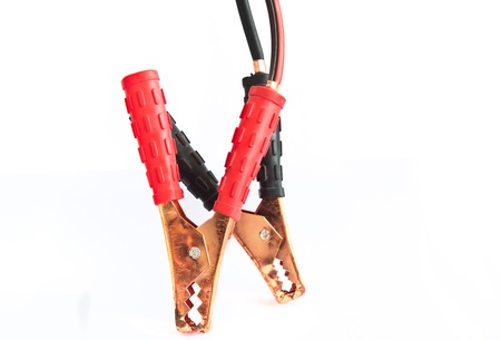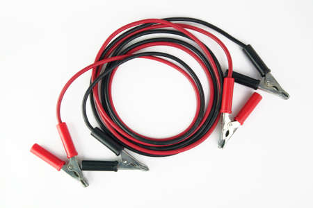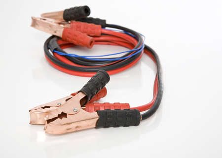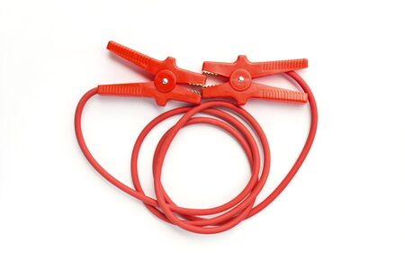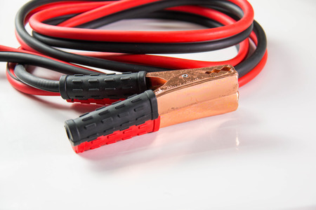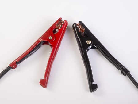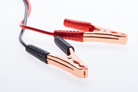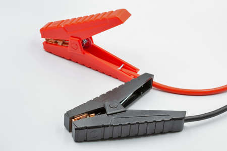 Black and red copper clamp with jumper cable for car battery charging, selective focus