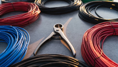Close-up view of a battery charger cable featuring red and black lines, ready for use and providing contrast against a black background.