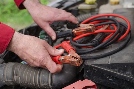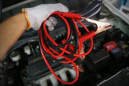Focus car mechanic hand holding battery electricity cables jumper for charging car battery and repairing a broken car by connecting the battery, Services car engine machine concept