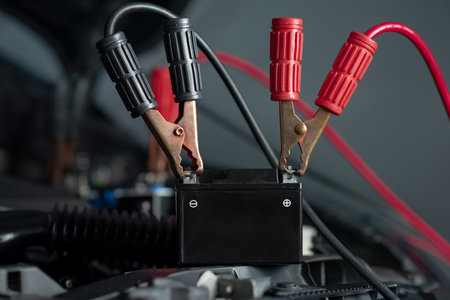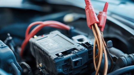 A close-up of a car battery with jumper cables attached, ready to jumpstart a vehicle, symbolizing roadside assistance.