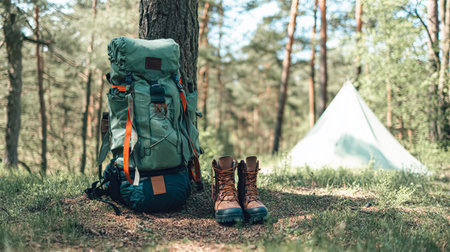 Hiking and camping equipment in forest. Backpack, water bottle and leather ankle boots. Panoramic view with copy space.
