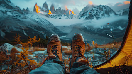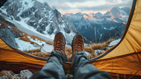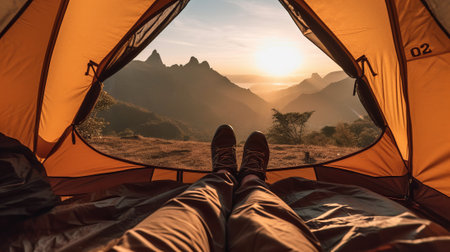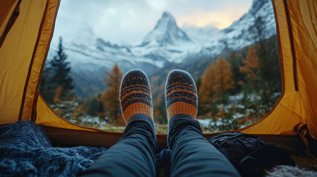 Cozy feet in warm socks peeking out from a tent while enjoying a breathtaking mountain view at dawn. Generative AI