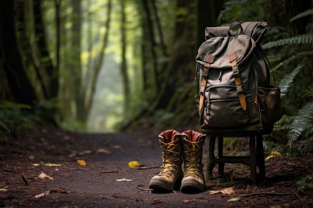foggy mountain hike with close-up of hiking boots and backpack, created with generative ai