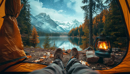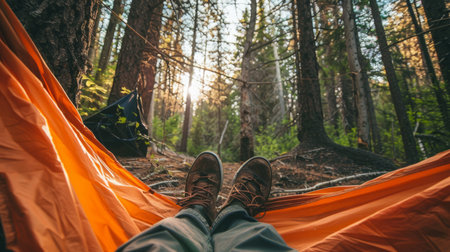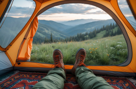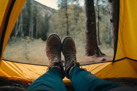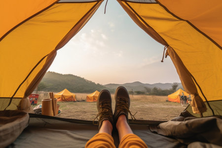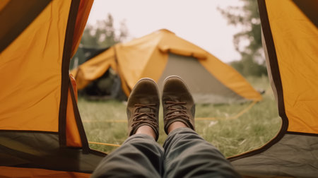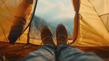 A man's feet inside a tent, in the style of romantic landscape vistas, yellow and orange, photorealistic landscapes, cabincore, high-angle, Generative AI