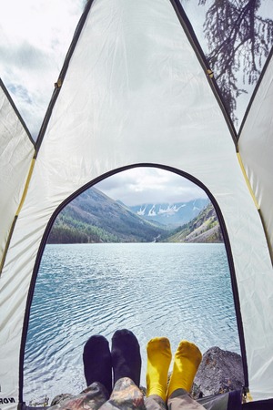Close up tourists resting in tent at highland concept photo. First view person photography with mountains on background. High quality picture for wallpaper, travel blog, magazine, article