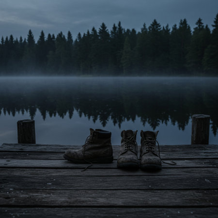A pair of hiking boots on a wooden pier on a misty lake