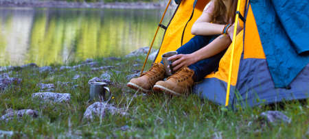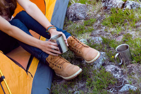 Girl in hiking boots, having fun and enjoying the rest at the camps. The concept of rest for a holiday in hikes, traveling lifestyle adventure summer vacations outdoor.