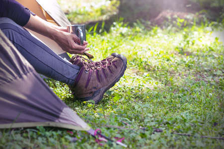 Relaxation concept. Legs in boots of woman camping in forest, holding cup, empty space