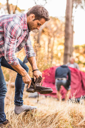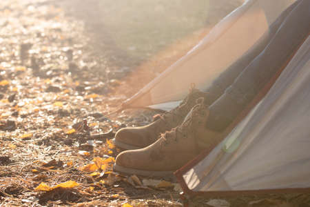 Closeup of men's shoes at the camping site.