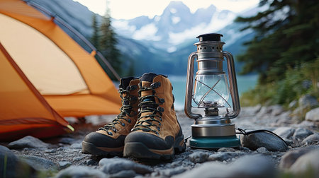 A camping lantern, a pair of hiking boots, and a portable stove arranged beside a tent on a rocky camping site.
