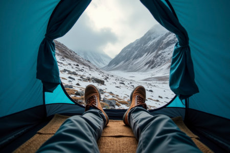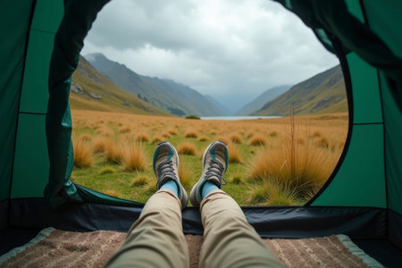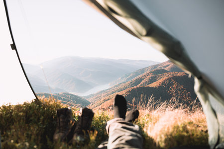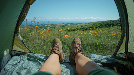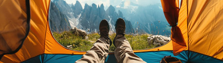 Legs of a tourist sticking out of a tent overlooking the mountains. Generative AI
