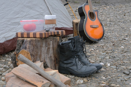 boots, guitar and tent on the picnic outdoor with copy space