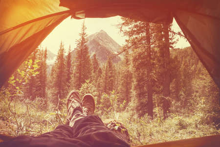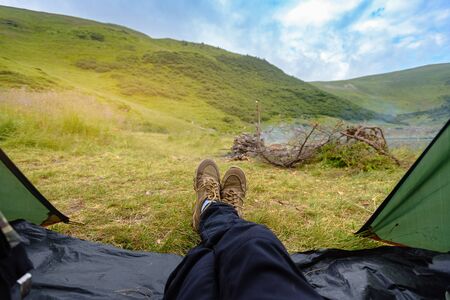 Feet man relaxing in tent with beautiful mountain view. Camping,travel concept. View from the tourist tent to the mountains. Guy in the boots lies on the back beauty