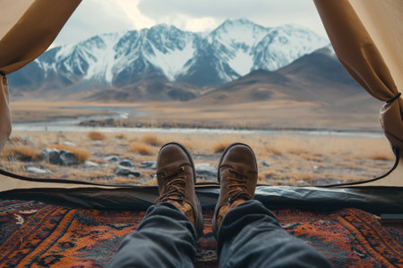 Step into tranquility with your cozy feet outside the tent, surrounded by the majestic mountain landscape. Embrace the serenity of nature on a unique adventure.