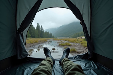 View from a tent towards a rainy mountain landscape with puddles, fir trees, and a cloudy sky. Hiking boots in the foreground emphasize the raw and authentic experience of being in nature, even in bad weather.
