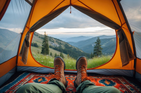 View from a tent with an orange interior towards green hills and forests at sunrise. Hiking boots and a colorful carpet in the foreground highlight the sense of adventure, simplicity, and connection to nature.