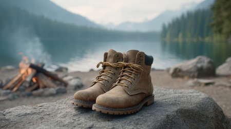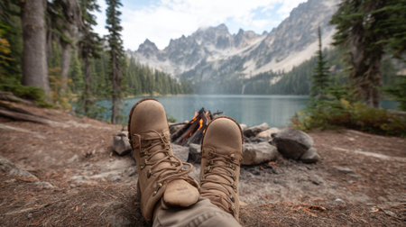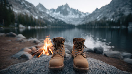 A pair of rustic boots rests on a stone near a campfire, overlooking a serene lake fringed by majestic mountains, embodying adventure and peaceful moments in nature.