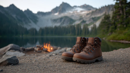 A pair of hiking boots sits in front of a tranquil lake, complemented by a lively campfire. This serene landscape captures the essence of adventure and relaxation in nature.