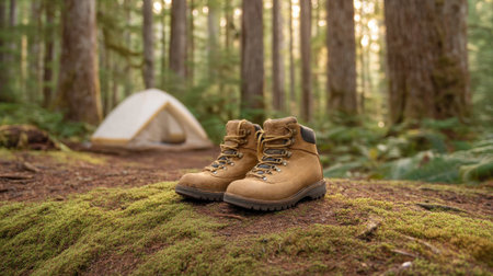 A pair of brown hiking boots rests on a mossy forest floor, capturing the essence of adventure with a cozy camp tent in the background, perfect for outdoor enthusiasts.