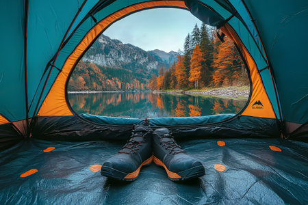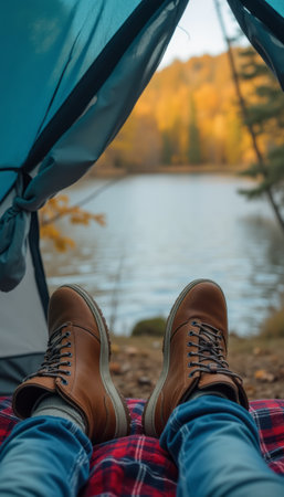 A pair of brown boots rests comfortably on a plaid blanket inside a tent, framing a serene view of a tranquil lake surrounded by autumn foliage. This inviting scene captures the essence of outdoor adventure and relaxation, inviting viewers to embrace natures beauty and the warmth of cozy moments