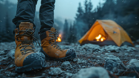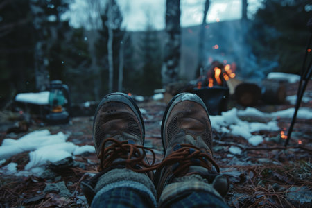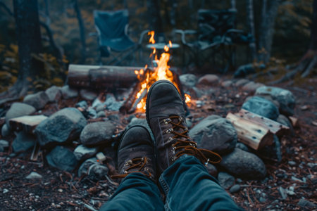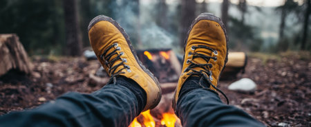 aged boots beside a campfire in a forest setting, created with generative ai