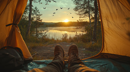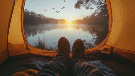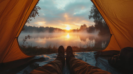 Relaxing by the lakeside at sunrise, a camper enjoys natures beauty from the comfort of a tent in early morning light. Generative AI